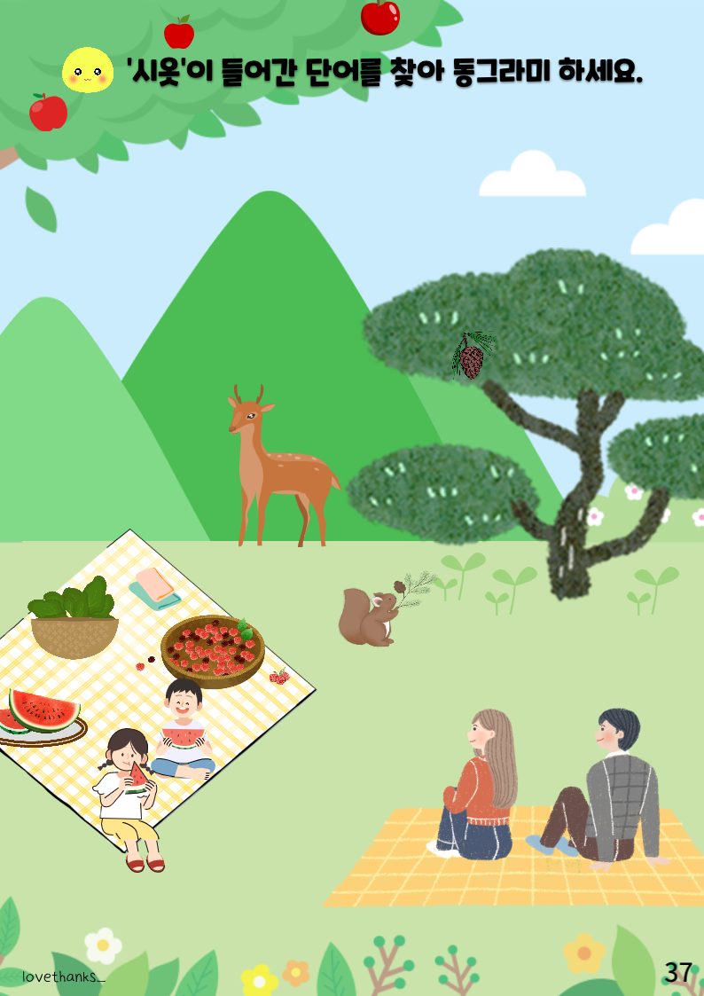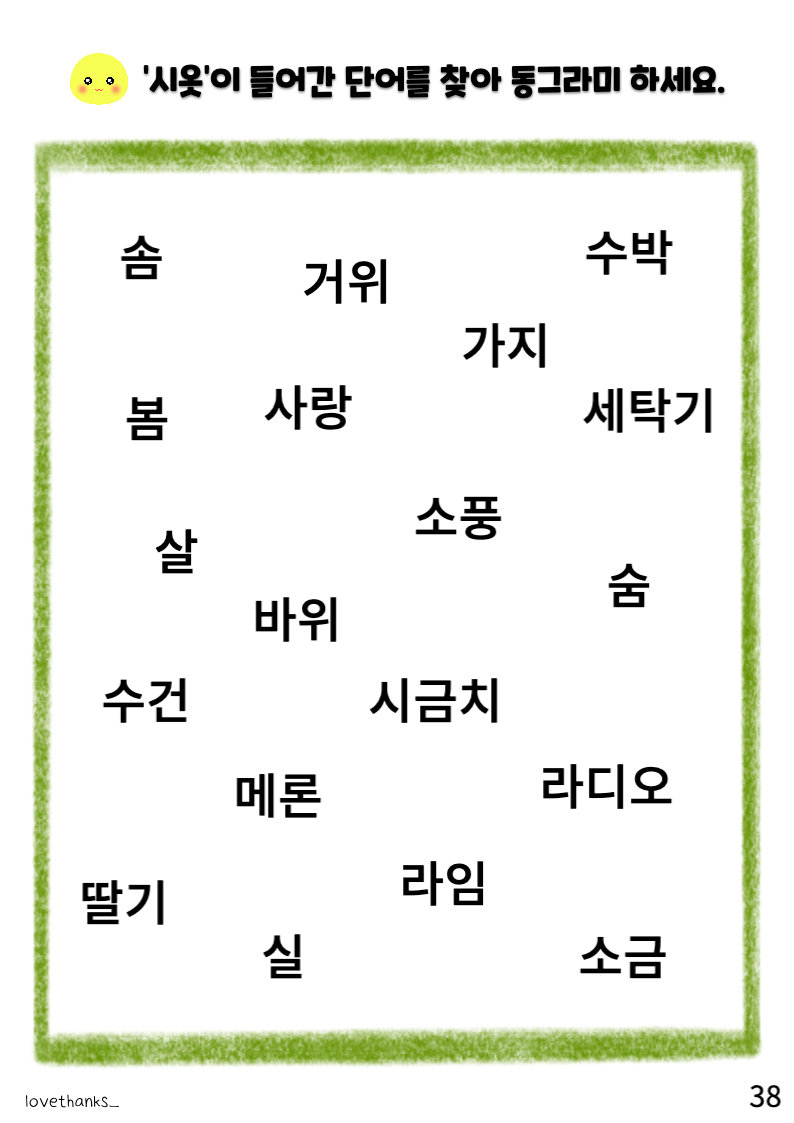 정리 활동-'ㅅ'이 들어간 낱말 찾아 동그라미 하기 정답: 사과, 산, 솔, 소나무, 사슴, 산딸기, 시금치, 수건, 수박, 살, 사람, 새싹