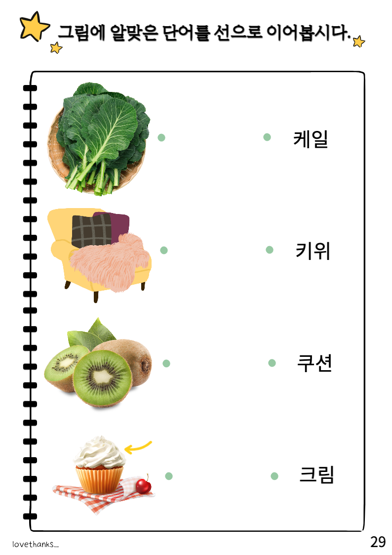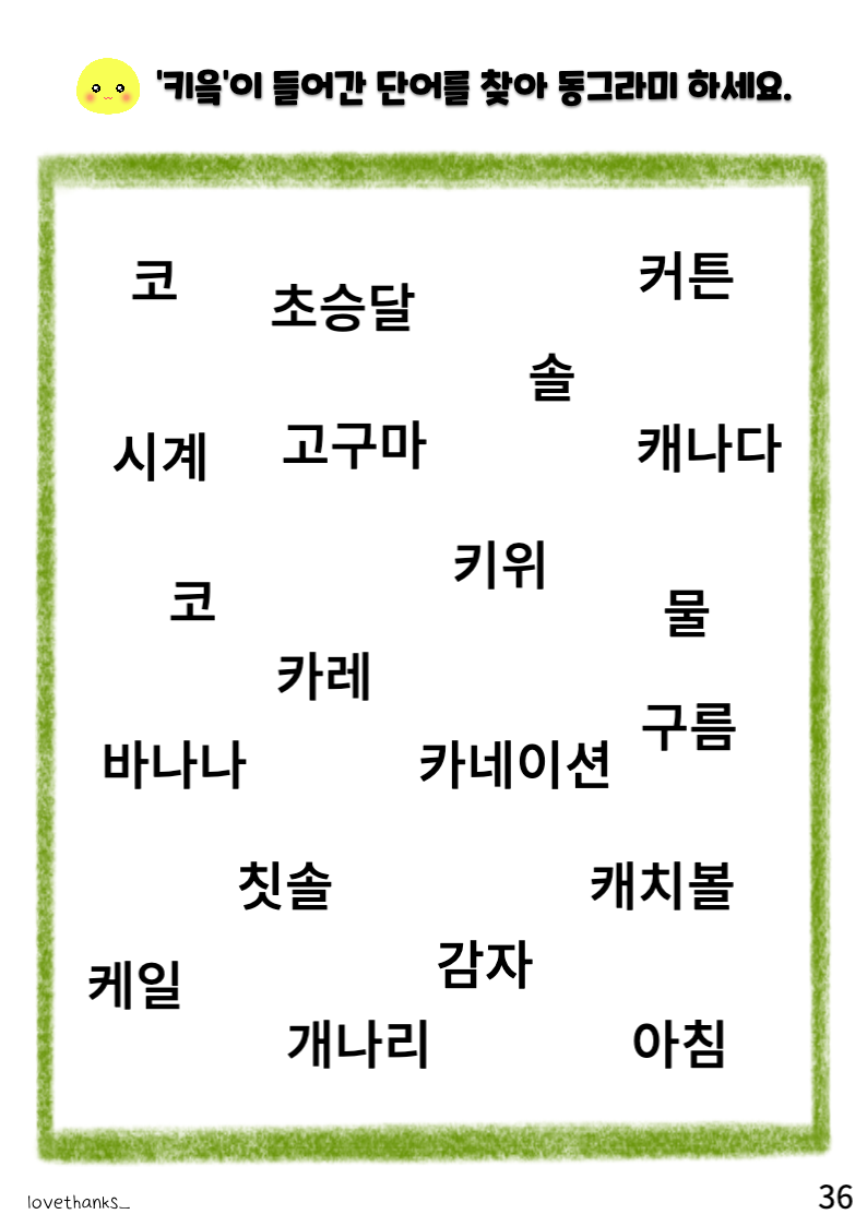 정리 활동 - 'ㅋ'이 들어간 단어 찾아 동그라미 하기 정답: 커튼, 콩나물, 쿠션(고양이 뒤), 코, 콩, 칼, 커피, 쿠키, 크림, 키위, 카메라, 카카오, 캐나다, 케이크, 카네이션, 카멜레온, 크레파스