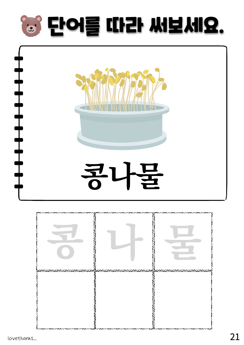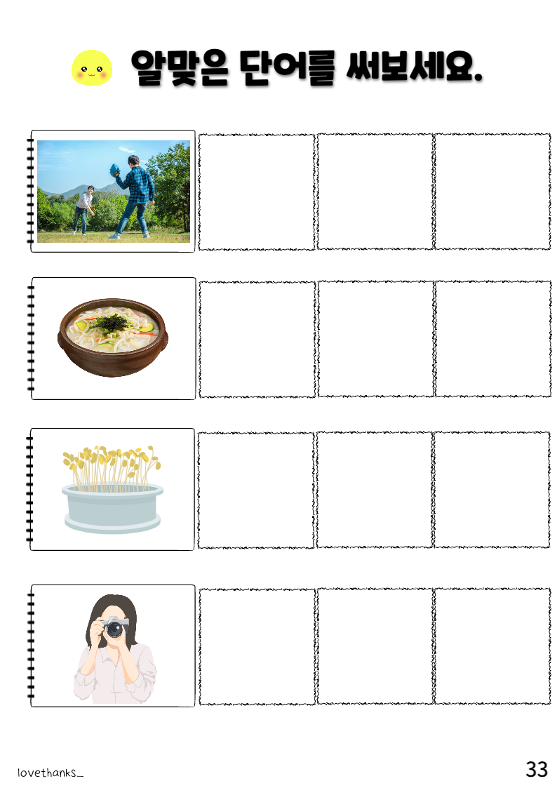 *이 자료의 저작권은 lovethanks_ 블로그에 있습니다.몽글몽글-한글한글-ㅋ.pdf16.25MB2023.02.09 - [교육 자료 나눔] - 한글 공부 | 몽글몽글 한글한글 10.치읓 | 학습지 하나로 끝내기